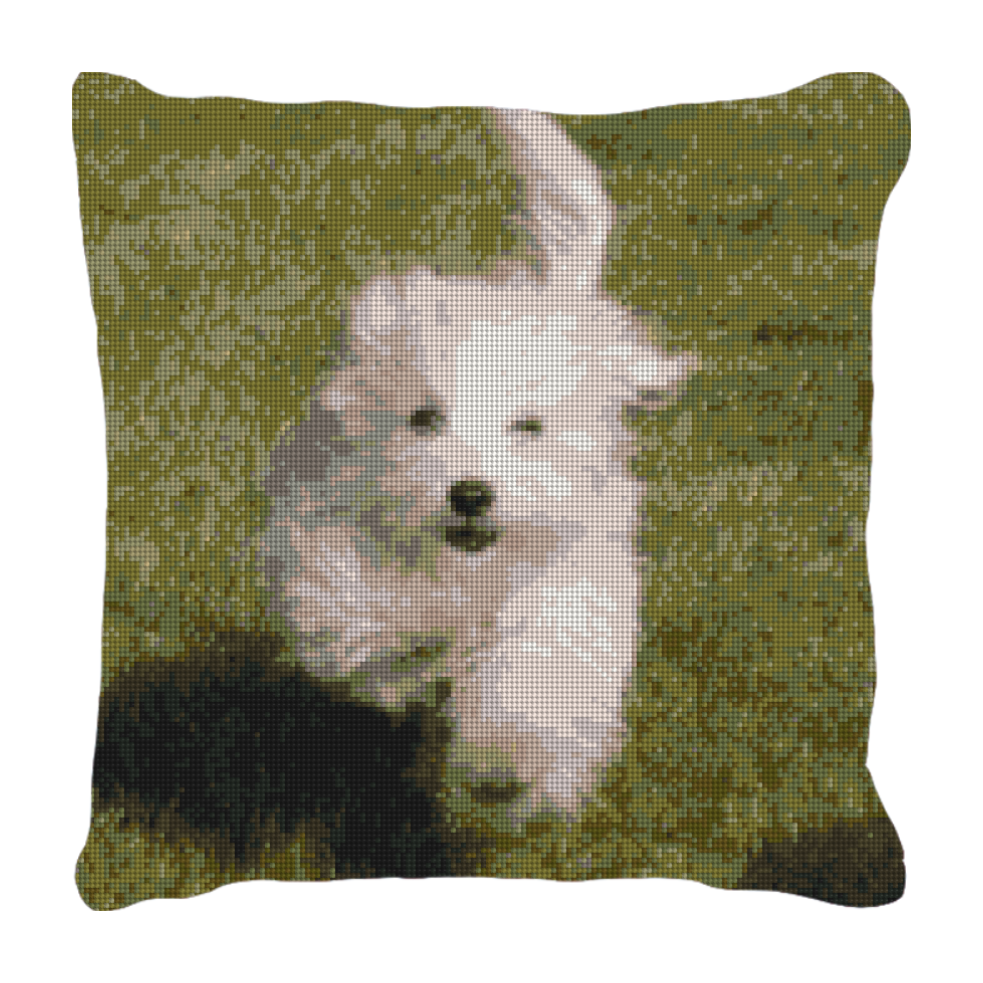 Often mistaken for a white poodle, the Bichon Frise is always white with black eyes and black noses. Curios, peppy and playful, this dog is sure to please, and always willing to be your lap dog. Stitch our Bichon Frise needlepoint pillow, and add some sparkle to your sofa. (thread is optional, does not include finishing materials)
