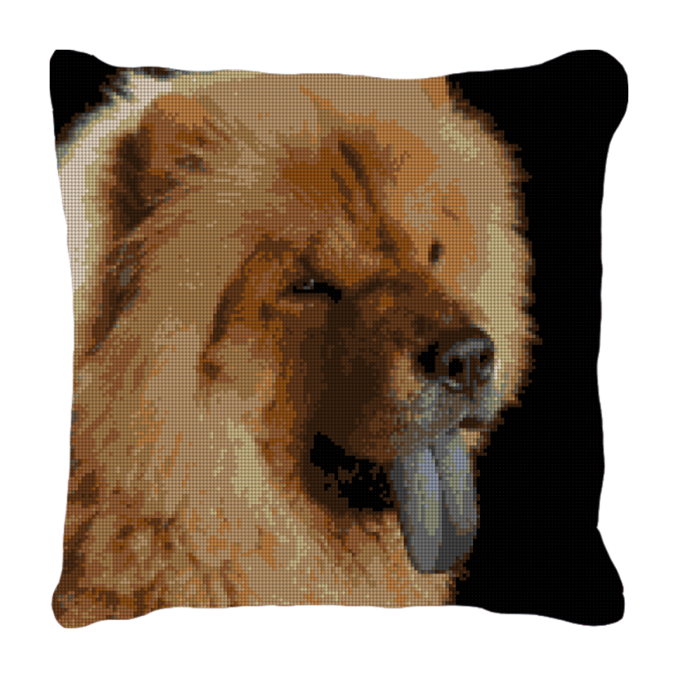 Chow Chows are most memorable by their physical feature - the blue black tongue. According to Chinese legend, the tongue got it colors during the time of creation, when the sky was being painted the Chow licked up drops of the color. Bright, dignified and fiercely protective, the chow is wonderfully depicted on our needlepoint pillow canvas. (adapted from a photo by Luigi Borromeo) (thread is optional, does not include finishing materials)
