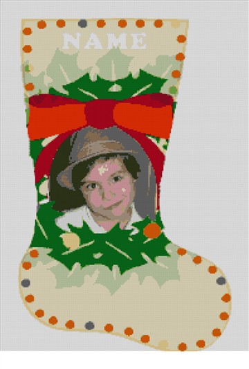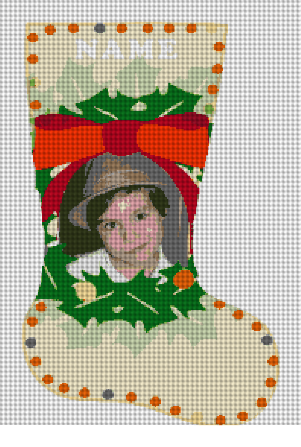 Include your Photo on this personalized Christmas stocking needlepoint canvases this year for Christmas! Hand Made on Zweigart Mono Canvas, these canvases are made to your specifications. Colors, words, names, mesh and overall sizes can all be adjusted to your preferences. (Thread is optional, does not include finishing materials)See more on our blog about personalized needlepoint stockings(Kits include canvas and thread only)