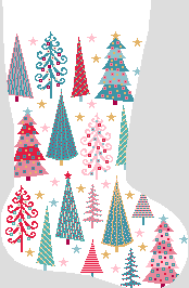 Whimsical with plenty of personality, these holiday trees take on a fresh and playful life of their own! This year add a little whimsy to your Christmas mantle and stitch this amazing needlepoint stocking canvas. Please feel free to personalize this design with the name of your choice. (DMC embroidery floss is optional, does not include backing or edging) (GG)