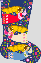 The charm, grace and elegance of these folk art angels will bring joy to your holiday decor. Beautifully embellished with a festive floral motif, we know you will have fun stitching this Christmas stocking! Handmade stockings are the perfect way for your family to create lasting holiday memories. We would be happy to add the name of your choice to this beautiful design. (DMC embroidery floss is optional, does not include backing or edging) GG