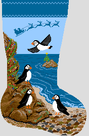 Sharply dressed in black and white, these playful puffins are incredibly friendly and ready to celebrate the holidays at this charming coastal cliff setting. Stitch this needlepoint stocking canvas and capture the playful spirit of this wintertime design. We would be happy to personalize this stocking with the name of your choice.