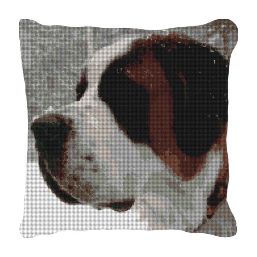 The Saint Bernard is famous through its tales of rescue with the iconic barrel around its neck; as well as its enormous size. Calm, patient and sweet, this gentle giant is also a great "nanny" dog. Weighing in between 140-260 pounds, our Saint Bernard needlepoint pillow canvas won't take up nearly as much room as the real thing. Fun to stitch, and fun to display in your living space. (adapted from a photo by: ofrockwood) (thread is optional, does not include finishing materials)