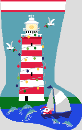 Santa is setting sail today to enjoy a little rest and relaxation after a long day of decorating the lighthouse. Seagulls add the finishing touches to this clever candy cane theme; and the dolphins share stories of their adventures with Santa. Watch the holiday magic unfold on Christmas morning when everyone discovers the bounty inside of their lighthouse Christmas stockings . . . that you have so carefully stitched! (DMC embroidery floss is optional, does not include finishing materials)