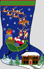 Santa has just delivered the most incredible presents to your house! Up, up and away the reindeer fly with all of the excitement unfolding before your very eyes. Create your own timeless Christmas heirloom and stitch this fabulous needlepoint Santa's sleigh stocking DIY kit for your mantle, completely personalized with your name. (DMC embroidery floss is optional, does not include finishing materials)