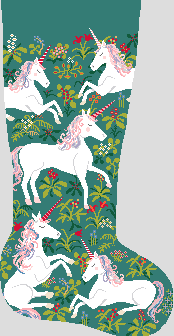 With one small peek through the forest edge, you will find a magical group of elusive unicorns! This year add a mythical feel to your Christmas mantle and stitch this amazing needlepoint stocking canvas. Please feel free to personalize this design with the name of your choice. (DMC embroidery floss is optional, does not include backing or edging) (GG)