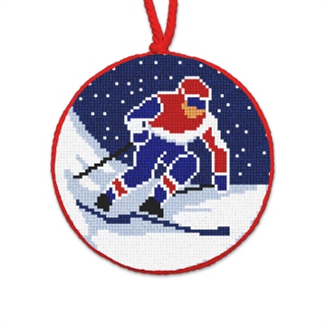 Zigzagging downhill at full throttle, with speed and agility woven into every turn -- slalom skiing! Frosty fun needlepointed with the thrill of winter competition.
